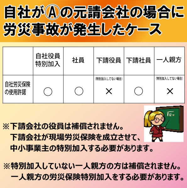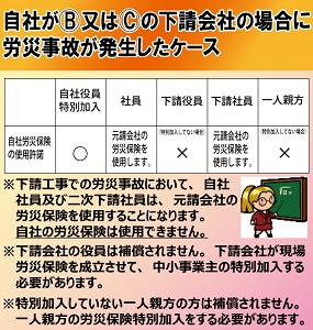 国の労災保険では、事業主は労災保険の適用を受けることが出来ません。しかし、実際の事業主の方は、従業員(労働者)以上に現場で仕事に従事しており、このようなケースにおいては、特に労働者に準じて保護することが適当であると認められるものです。