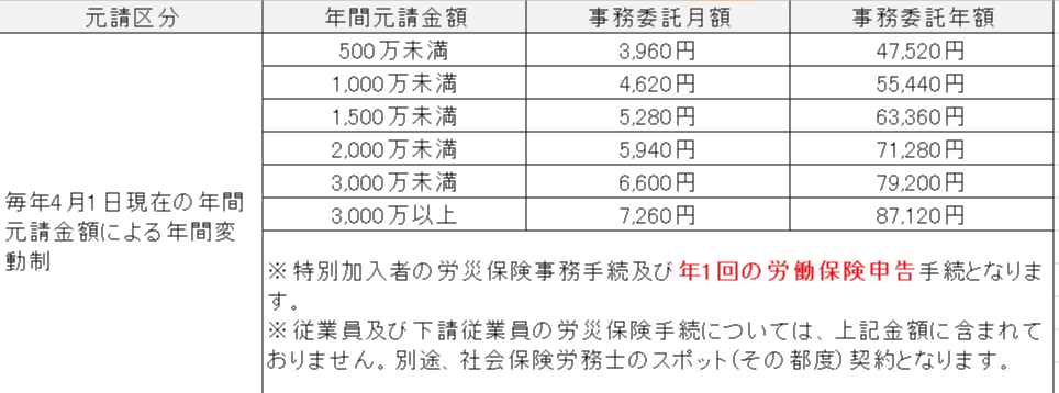 従業員及び下請従業員の労災保険手続については、上記金額に含まれておりません。別途、社会保険労務士のスポット(その都度)契約となります。